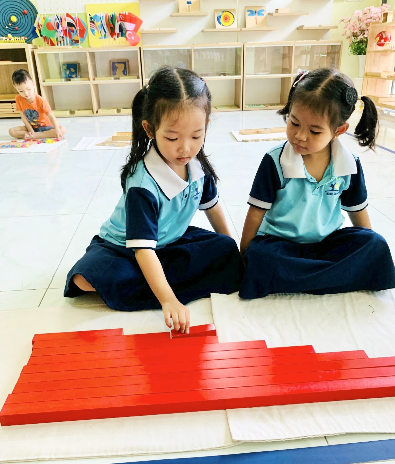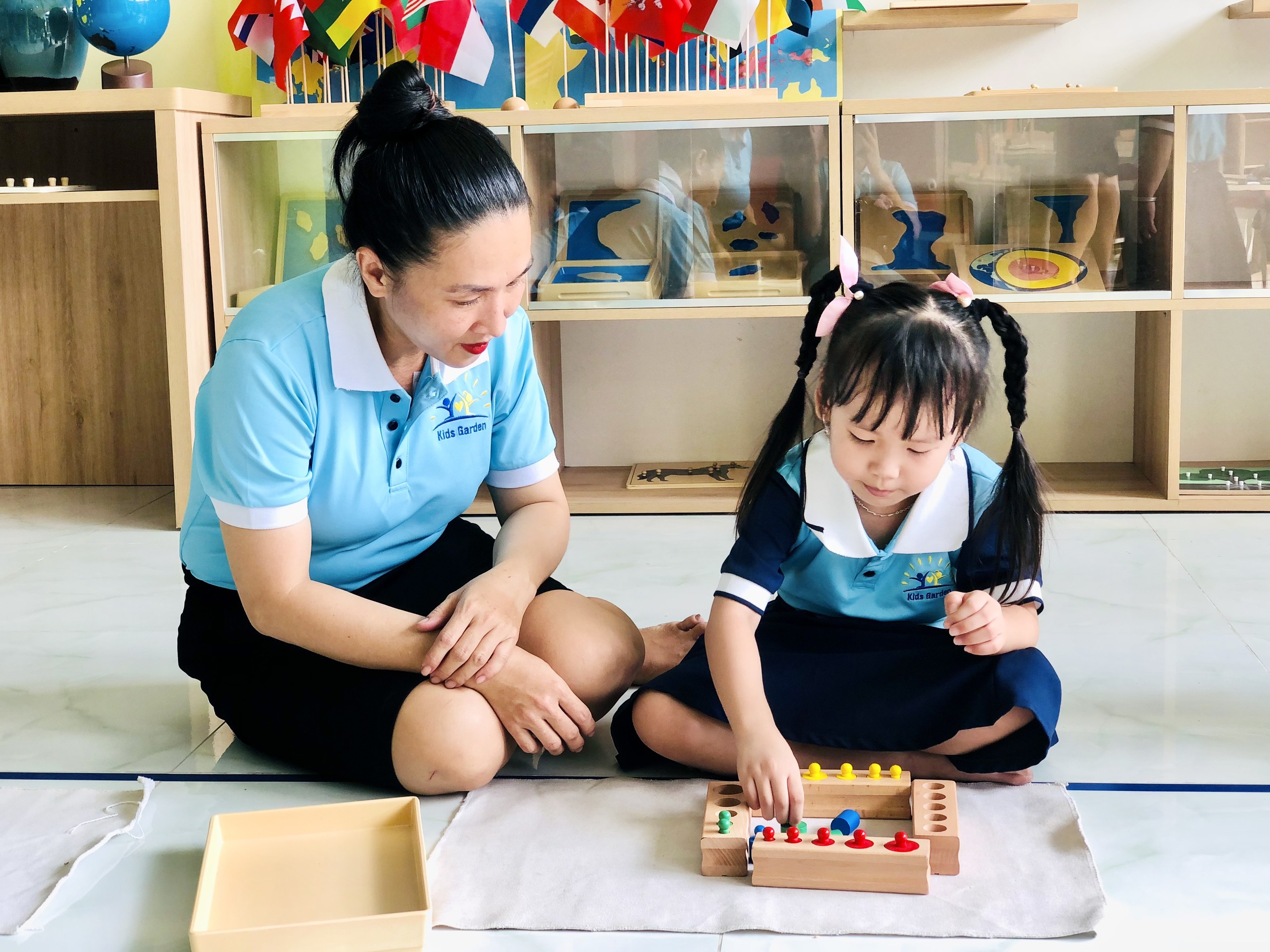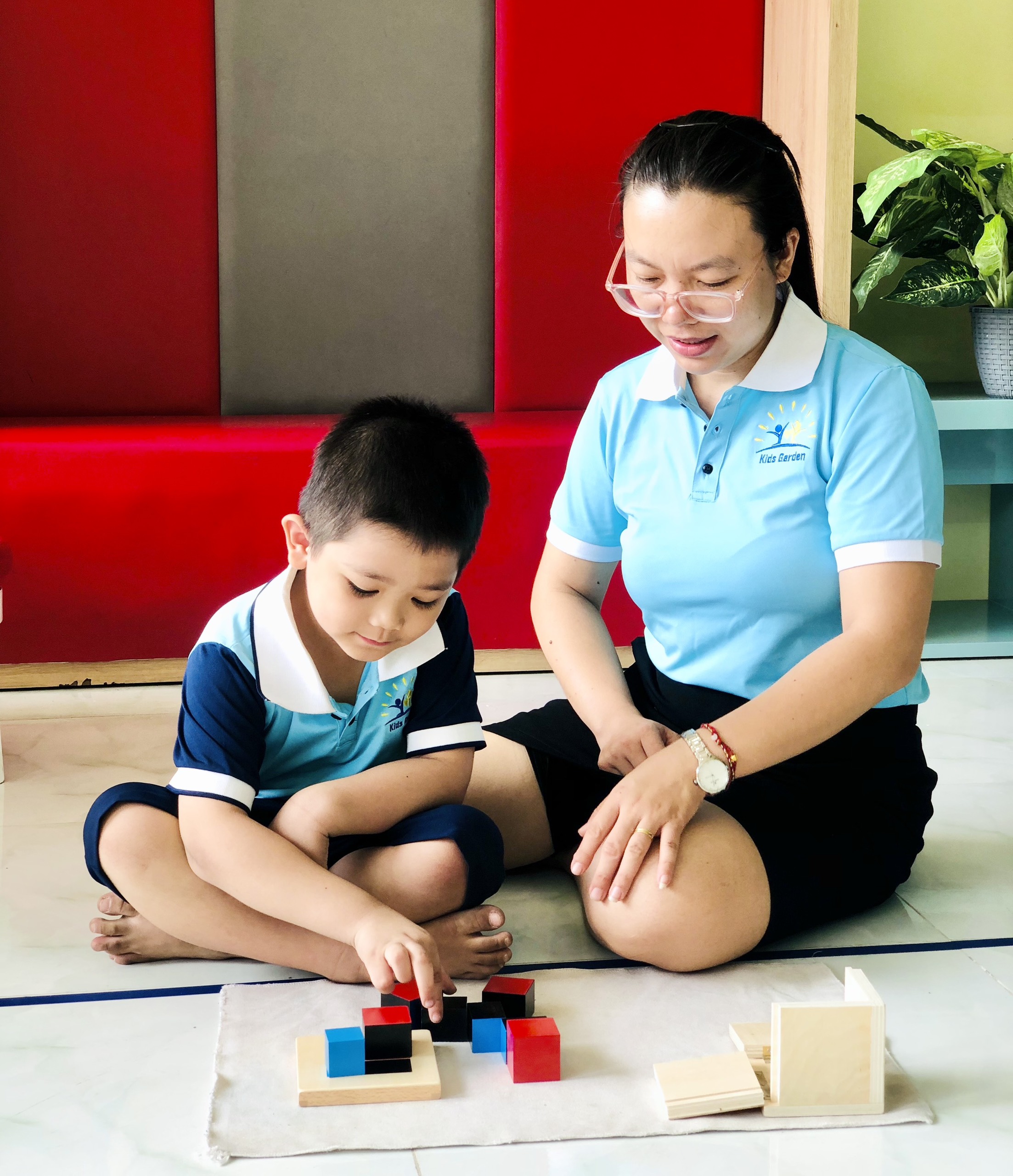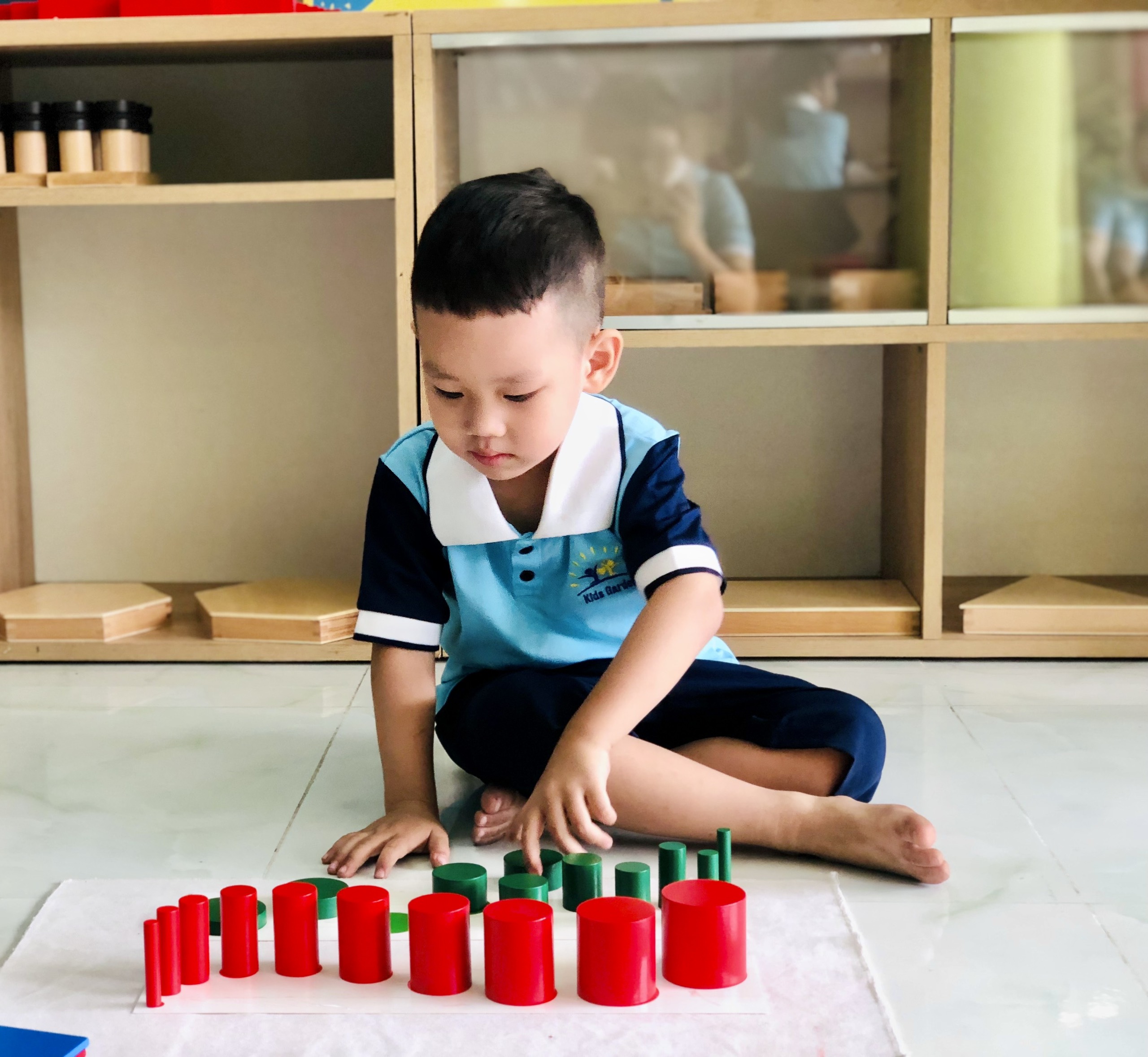 Phát triển thị giác: Các bài học với bộ hình trụ có núm, tháp hồng, cầu thang nâu, cây gậy đỏ, tủ hình học, các hộp màu… giúp trẻ tăng khả năng nhận biết kích thước dài – ngắn, to – nhỏ, độ dày – mỏng, rộng – hẹp, hình dáng của các vật thể và phân biệt các loại màu và độ đậm nhạt của các màu…